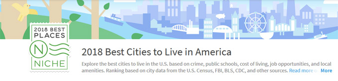 Niche每年公布的学区、城镇排行,是人们安家落户的重要指南。2018“全美最适合居住城镇”排行,共考察了全美228个城市、15000多个城镇和社区。本次排行的四大评分标准包括:受过本科及以上高等教育的居民比例、消费水平、房价及房产税、公立学校。 此外,社区治安、就业机会、大都会通勤族上班的便利程度、各项令人舒适的社区设施、当地居民的评价与反馈,也是本次排行的重要因素。