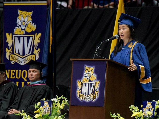 公立学校教育质量,是全美最宜居城市评比的重要指标。图为瑞柏市Neuqua Valley 高中毕业典礼上一名华裔学生发表演讲(Daily Herald photo)
