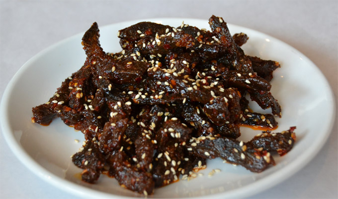 麻辣诱惑全新风味小吃麻辣牛肉干,新鲜牛肉切块飞水,加大葱姜片去腥,砂锅加八角、三奈、花椒、陈皮等炖煮一个小时,之后加四川花椒粉、肉桂粉等在锅里混和炒香,沾裹炒香的芝麻而成。这道麻辣牛肉干,肉块有嚼劲儿,不柴不老,麻辣适中并伴有麻想,餐前小吃,下酒好菜,还可打包带走,当成日常零食。
