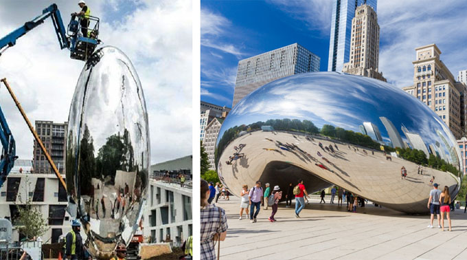)设计,通体亮晶晶,由打磨细腻如玻璃的不锈钢包裹钢架而成。不过,修斯度的豆子是竖着的,芝加哥的豆子则是躺着的。