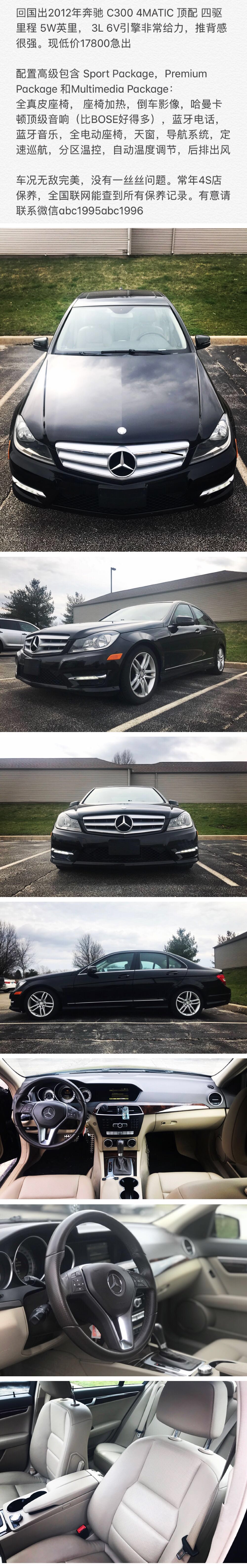 回国出2012年奔驰 C300 4MATIC 顶配 四驱 里程 5W英里, 3L 6V引擎非常给力,推背感很强。现低价17800急出