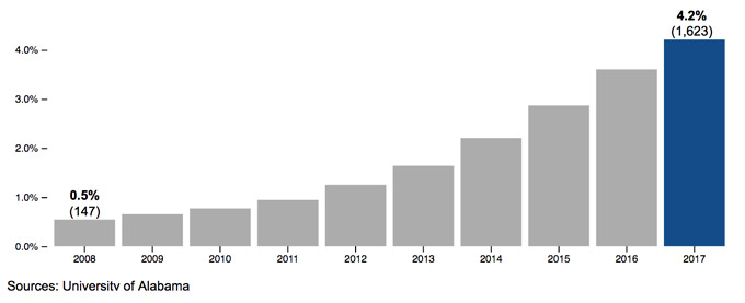 在2017年共有203名伊州学生接受了阿拉巴马大学提供的全额奖学金,这笔奖学金可为每位学生节省近10万美金的花费。这些来自伊州的优秀学生将为阿拉巴马大学的学术发展和综合排名起到很大的帮助。