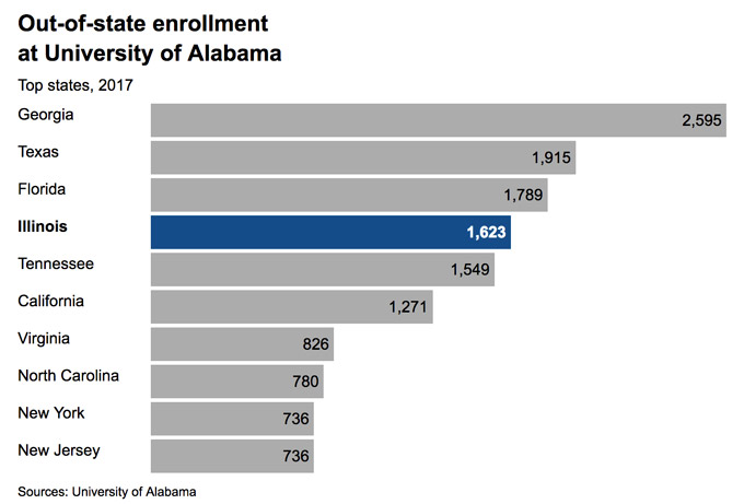 伊利诺伊州目前已经成为了阿拉巴马大学主要的生源地之一,它更是该校在南部以外地区最大的新生来源地。在阿拉巴马大学全部的外州学生人数中,来自伊州的学生人数仅低低来自佐治亚,德克萨斯与佛罗里达3州,成为了该校外州学生的第4大生源地。而在伊州之上的这3个州都是与阿拉巴马较临近的3个南部州。