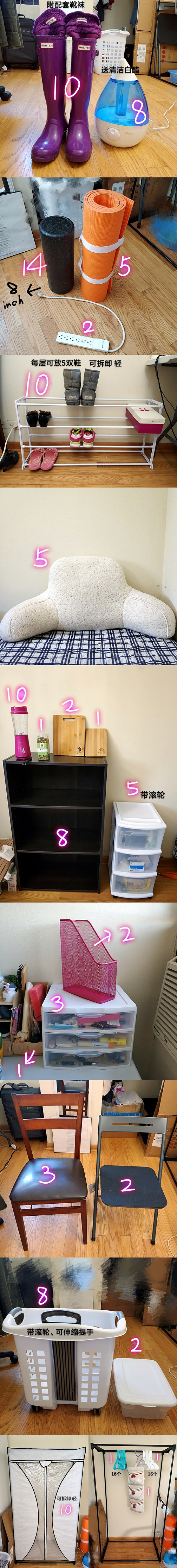 #出二手# 泡沫轴 18inch 14刀 | 插线板 2刀 | 四层鞋架,轻,可拆卸,每层可放五双鞋,10刀 | 大抱枕 5刀 | blender 10刀 | 莲子心 1刀 | 中丶小菜板,2刀 1刀 |大三层抽屉柜,带滚轮,8刀 | 书档 2刀 | 小三层抽屉柜 5刀 | 木质拼接架 1刀 | 椅子 2刀 | 洗衣篓,带滚轮丶可伸缩提手 10刀 | 小收纳箱 2刀 | 衣架两把各16个 各1刀 | 收纳袋 1刀 | 简易衣柜(可作衣柜也可作日常通勤衣物架)10刀