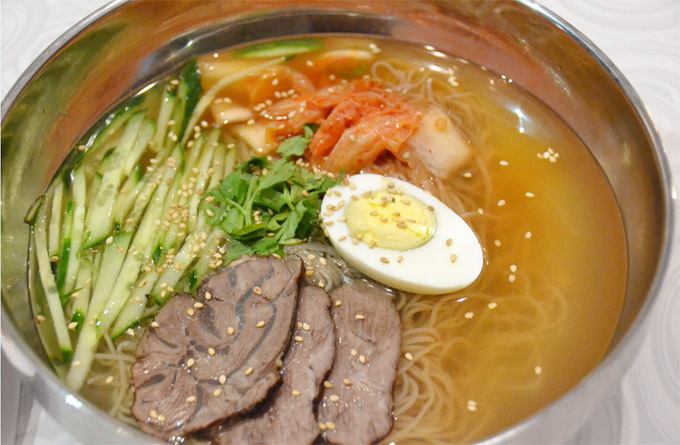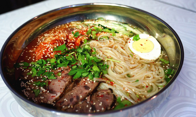 平壤冷面,在沈阳叫西塔冷面,主打东北街边美食的芝加哥小美兴餐厅,隆重推出西塔冷面。图为适合大众口味的西塔冷面之小麦黄面版