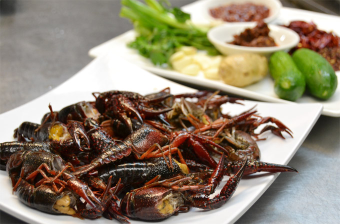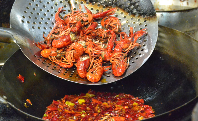 川菜大厨杨师傅介绍,鲜活的小龙虾从超市买回来,要先用清水精养来两三天。客人点了麻辣小龙虾,帮厨就会从捞出清水静养过的小龙虾,仔细清洗过,再过两道清水冲刷。遇到水龙头高压冷水的刺激,小龙虾个个舞起大钳,暗红的体色瞬间提高鲜亮度,足见小龙虾之威猛。