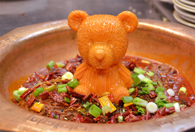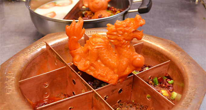 重庆火锅要浓香,非牛油火锅莫属。麻辣诱惑餐厅精心熬制的顶级牛油,会放到模具中冷藏,形成萌哒哒的维尼熊、中国龙造型。无论是大火锅、鸳鸯锅、奔驰锅还是九宫格,令人食欲大开的火锅底料加汤点火,维尼熊、中国龙造型的牛油,看着牛油萌到融化,浓香扑鼻而来,荡起双筷的时候就到来啦。