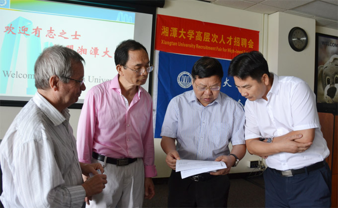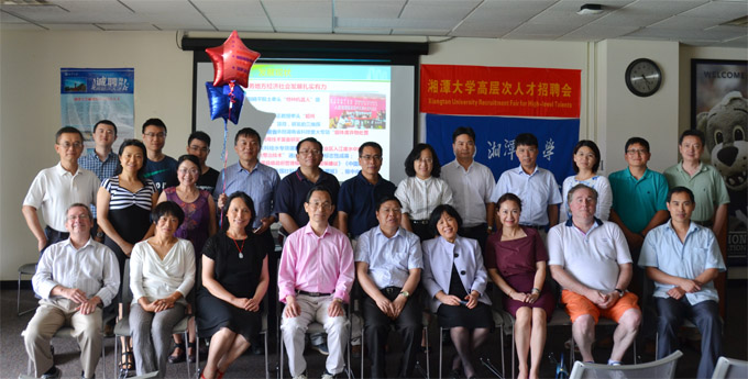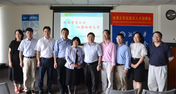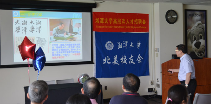 在当天的活动上,周益春校长发表演讲,向与会各方应聘人士介绍了湘潭大学的历史渊源、发展现状,以及吸引海外高层次人才的岗位与优厚待遇,为北美英才回湘服务架设一条绿色通道。周校长表示,湘潭大学诚聘具备入选国家重点人才项目或科学项目的领军型人才、具备入选国家“青年千人计划”人才项目水平的学科带头人,湖南省“百人计划”、湖南省“青年百人计划”也诚邀学术带头人、学术骨干和优秀博士加盟。