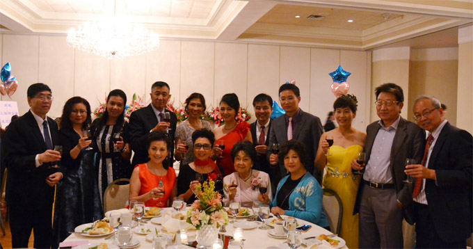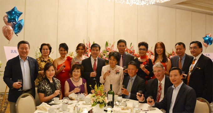 汪妈妈在余鹏副总领事的陪同下,为来宾们敬酒致意