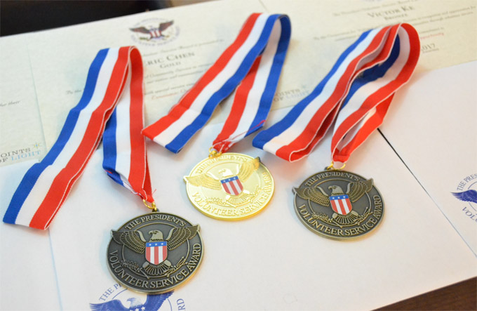 在当天的活动上,来自瑞柏市北部高中、瑞柏市中部高中,以及Hinsdale Central高中的四位杰出华裔青少年荣获“总统义工奖”,并由芝加哥西郊203学区委员梁保罗授奖。这四位华裔青少年,是芝加哥地区首批参与飞达学院“全球青少年领袖实习-宁夏扶贫之旅”的华裔高中生,他们分别是:陈劼明(Eric Chen),荣获“总统义工奖”金奖;夏翔(Taylor Xia),荣获“总统义工奖”银奖;柯行健(Victor Ke)、邹尽心(Vicki Zou)均荣获“总统义工奖”铜奖。