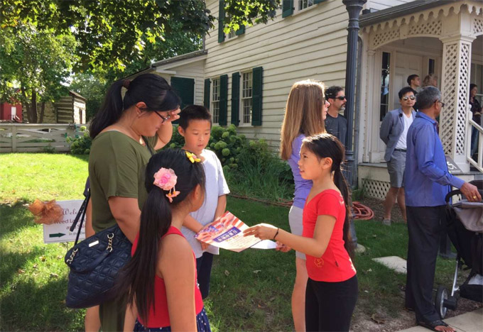 华人参政从政,从小做起。小志愿者向来宾散发动员积极投票的传单