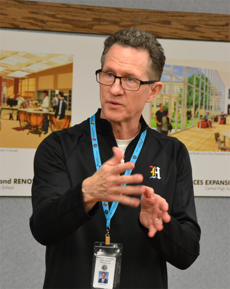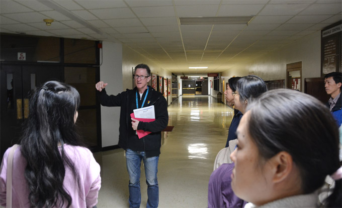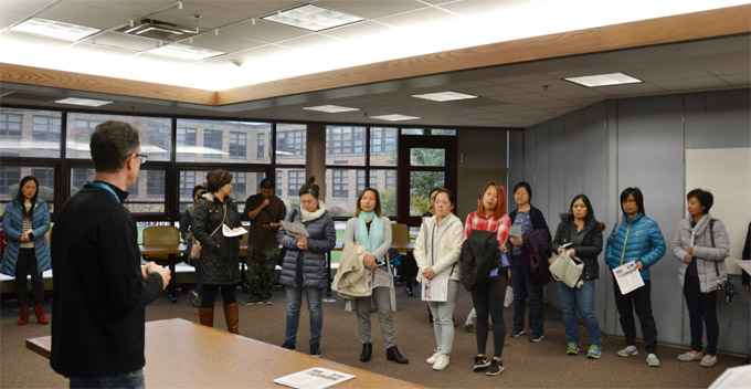 学区总监带领华裔家长们参观Hinsdale Central High School 的校舍