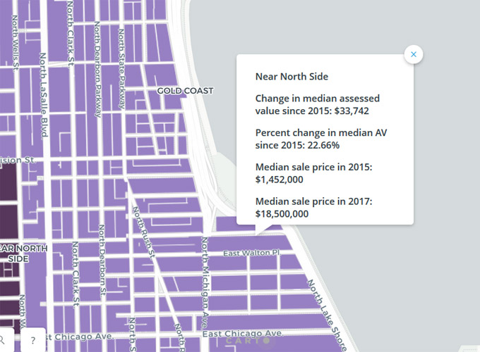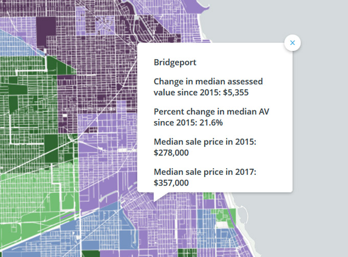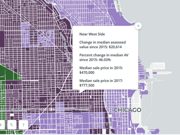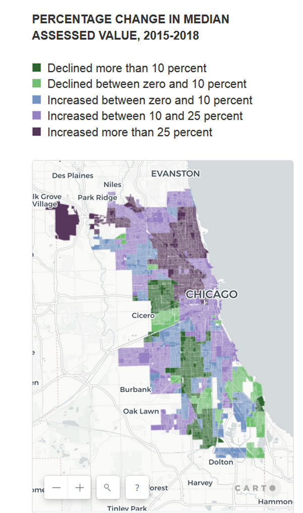 房产估值模式经过改进后,位于芝加哥的富裕社区、或正走向富裕社区中的住房估值普遍上涨,而位于城南、城西以黑人居民为主的社区,房产估值则以对等的幅度下降。