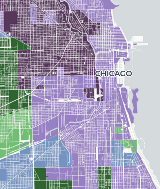 从《芝加哥论坛报》公布的数据地图上,我们可以看到,房产估值下降的社区(以淡绿色、深绿色标准的区域)均是以黑人居民为主的社区,这些区域与芝加哥的枪击案、暴力犯罪高发区域基本一致。而图中凡是淡蓝色、淡紫色、深紫色标注的区域,均为房产估值上涨的区域。