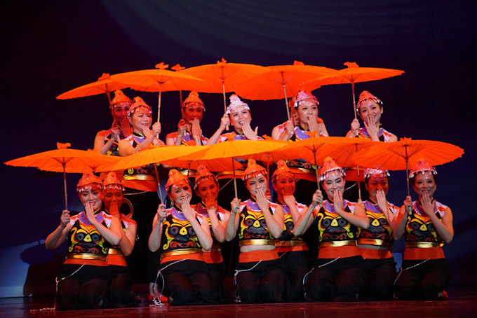 中国苗族舞蹈《红伞舞》,苗族姑娘撑着红伞,欢歌笑语,结伴而行。