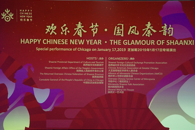 陕西省政府外事办公室副主任阚开沛在演出前致辞,他表示,本次陕西代表团包括艺术团、美食团、黄帝陵海外推介团,大家非常荣幸能在农历新春即将到来之际访问芝加哥,以文化美食贺新年,增进大家对陕西历史文化的了解,也希望芝加哥的朋友们能多去陕西观光旅游,洽谈合作。中国驻芝加哥总领馆刘军代总领事致辞中再一次强调中美的友好关系,以及感谢祖国对海外华人的照顾,每一年都派国内顶尖的艺术团体和慰问团来美国。这是我们华人的荣幸,也是祖国的伟大。华联会主席郑征女士感谢了这段时间以来忙前忙后的华联会的干事们,也感谢陕西代表团的到来,为我们芝加哥的冬日带来了一丝丝的温暖。芝加哥华联会常务副主席栾文琦担任主持。