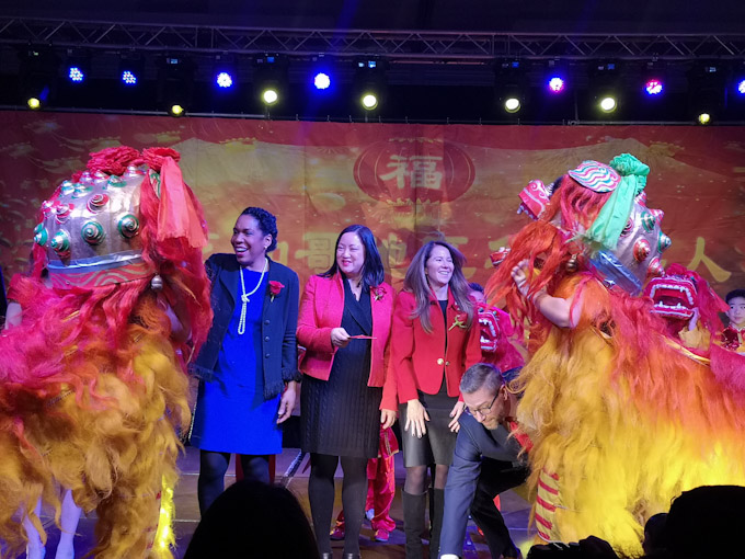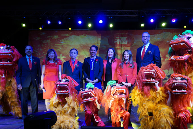 中国驻芝加哥总领馆代总领事刘军(左三),华联会主席郑征(左二),伊利诺伊州副州长朱莉安娜· 斯特拉顿(左四),美国联邦众议员拉贾(左一),伊利诺伊州众议员詹妮弗 · 宫-戈肖维茨(右二)、马静仪(右三),伊利诺伊州财长方仲华(右一)等嘉宾
