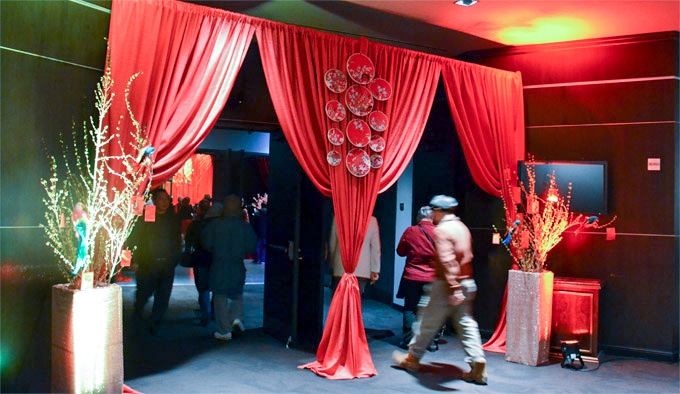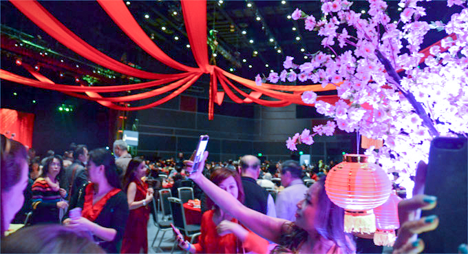 马蹄铁新春贵宾晚宴现场,著名The Venue演出大厅张灯结彩,烤金猪、灯笼、别样的桃花布景,处处洋溢着浓郁的中国新年氛围。马蹄铁总经理Dan Nita,市场部副总裁Shannon McKellar,市场部总监 Michele Ryba与亚洲市场行政代表Karen Lu,Jenny Ng, Kathy Huang,Maika Le,Tim Mai, Ava Gong等职员列队向贵宾们的到来表示热烈欢迎。