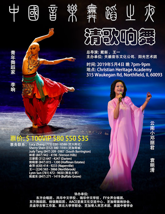 《芝加哥侨学网报道》芝加哥即将迎来一场震撼美的大型中国音乐舞蹈盛宴。5月4日晚, 2019央视春晚开场舞领舞,青年舞蹈家—李响、云南小邓丽君袁明清、央视常客,越战越勇冠军—歌唱家逯克德等艺术家将来到芝加哥演出,将为芝加哥人们献上超高水准的表演。芝加哥本地著名的艺术团体和学校以及艺术文化机构将会派上最优秀的节目与之共襄盛举!