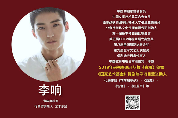 青年舞蹈家李响:中国舞蹈家协会会员,毕业于解放军艺术学院舞蹈系,曾任中国人民解放军总政治部歌舞团舞蹈演员。现为行舞坊的创始人和艺术总监,代表作《梦》、《花落知多少》、《红蓝军》、《莲花》、《西游》、《观音》等等。如果问在中国舞蹈界最具实力的,拿到舞蹈金奖最多的舞蹈家是谁?那就是李响。李响是拿到了舞蹈比赛界最多奖项的舞蹈家,包括第十届桃李杯舞蹈大赛金奖、第五届CCTV电视舞蹈大赛金奖、第八届全国舞蹈大赛金奖等等。2019年中央电视台春节晚会上,李响领舞的《春海》更让十几亿的中国观众朋友甚至是海外的观众朋友认识了这位红衣小哥哥。有观众评价他,他不仅有着男性阳刚之气,更有着女性柔软的美感,动作干脆细致且无可挑剔,高难度技巧娴熟且美感。另外,特别要提的是在2018年,第十一届中国舞蹈‘’荷花奖‘’比赛上,李响凭《不眠夜》拿到了现代舞金奖,这是跨越舞种的奖项。