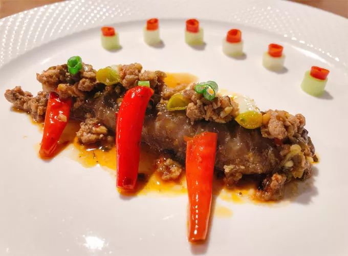 干烧辽参,川菜系传统名肴。美食珍品辽参,浸泡变松软脆嫩后,入高汤煨制,配冬笋肉粒、芽菜等,味道鲜美,滋补佳品。