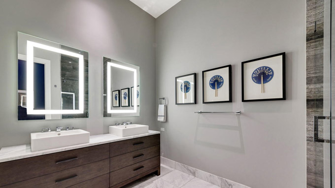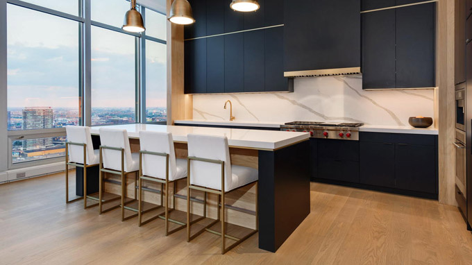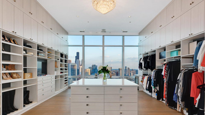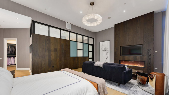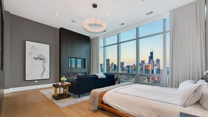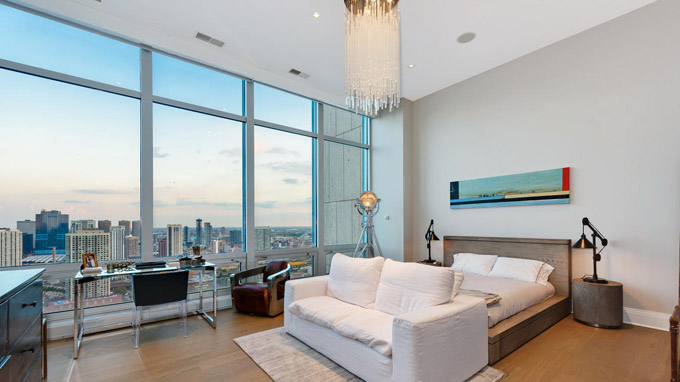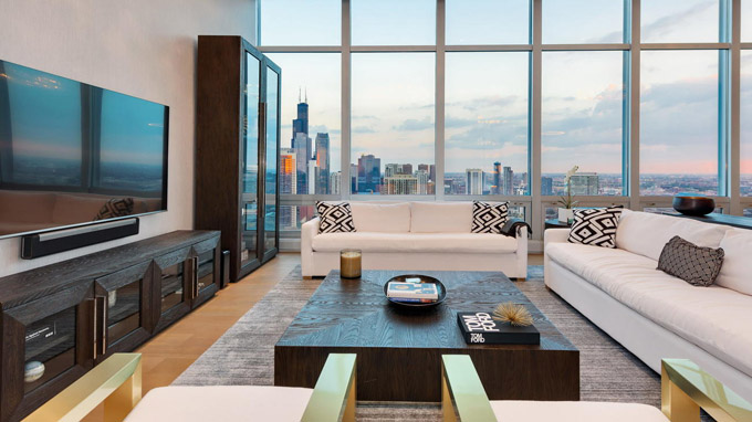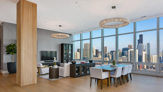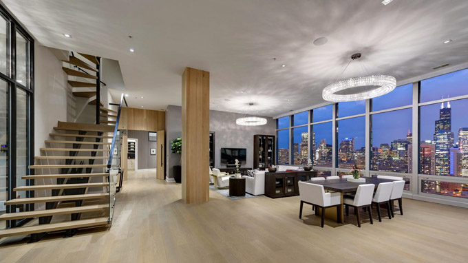 这套芝加哥市中心River North社区的豪华顶层公寓(Penthouse),居住使用面积4800平方英尺,还有1000平方英尺的私人户外空间,由著名设计师Kristy Yarbrough设计。