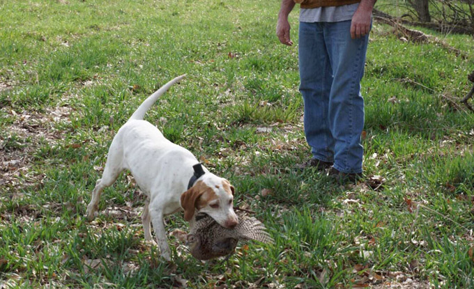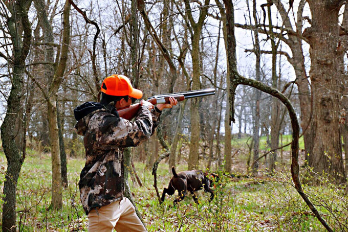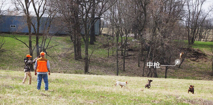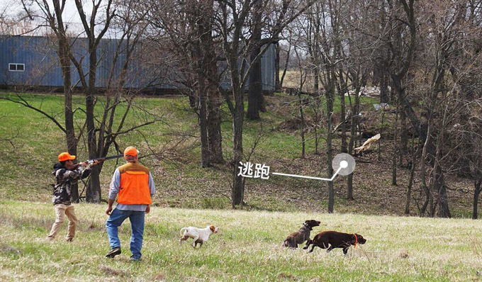 向导提供的枪支,是一种最适合打鸟禽的双筒猎枪,每次只有两发子弹。下车来到狩猎现场,向导刚刚讲完安全要领和注意事项,不到两分钟猎狗们就发现猎物,在猎狗的逼近的时候,草丛中飞出一只鹧鸪,儿子举枪,一发命中。猎狗随之一拥而上,咬住猎物送到儿子跟前。