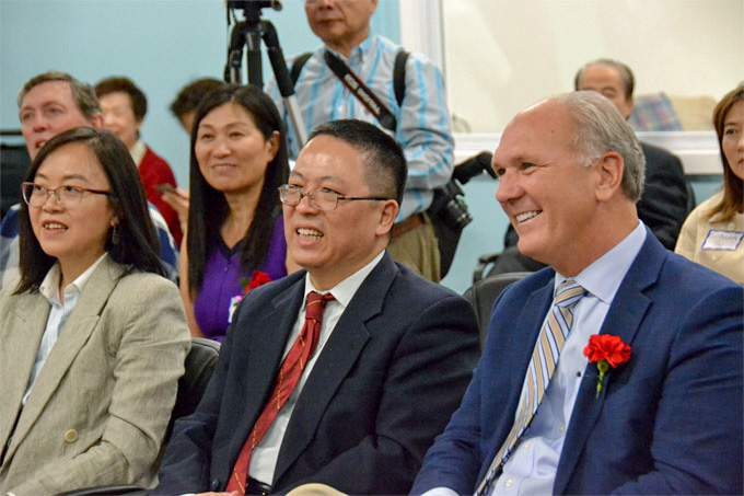 瑞柏市市长奇瑞科(Steve Chirico),中国驻芝加哥总领事馆黄黎明副总领事、周蕾领事,伊州州务卿亚裔顾问委员会主席马森柱,芝加哥福建商会会长郑时坦,美中亚裔健康协会主任刘红博士等各界嘉宾莅临,全新的希林亚裔社区中心剪彩。
