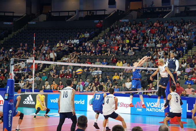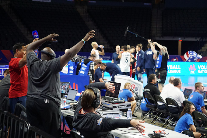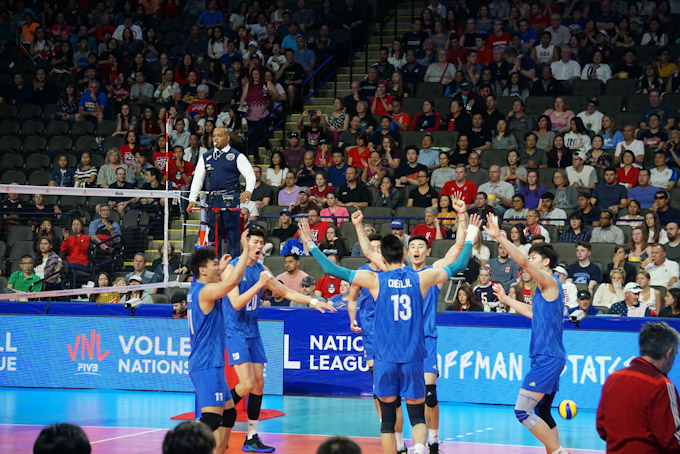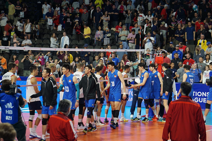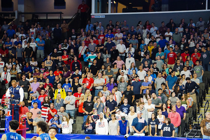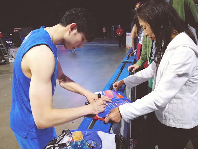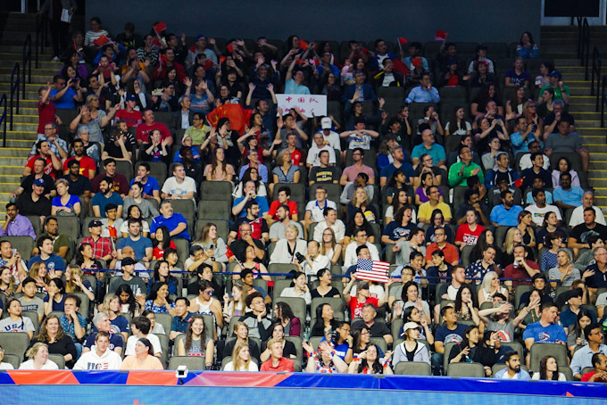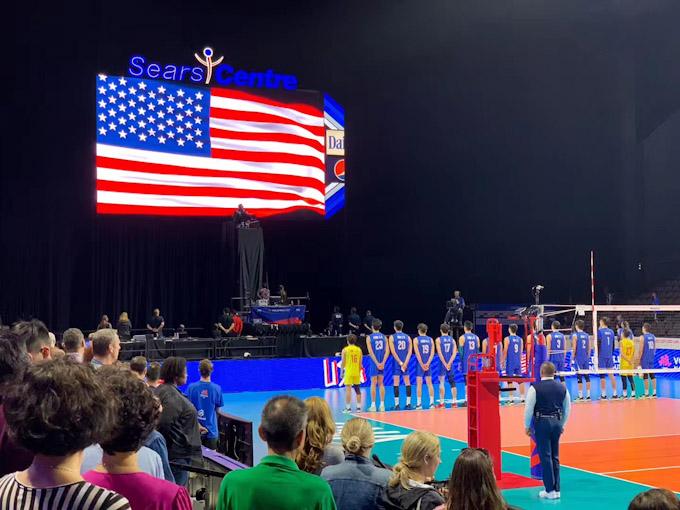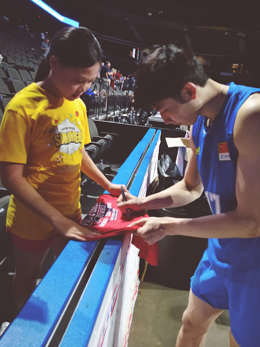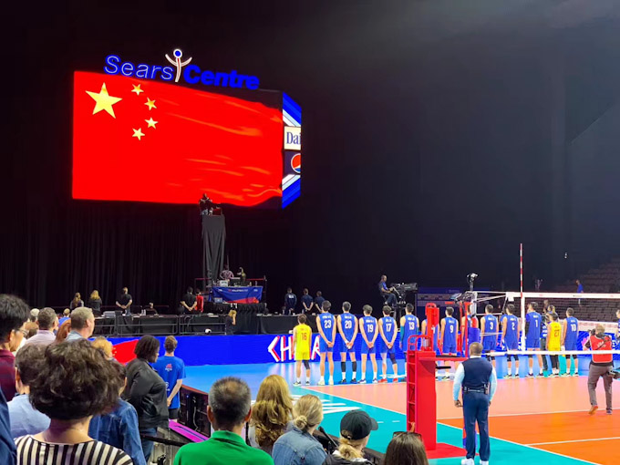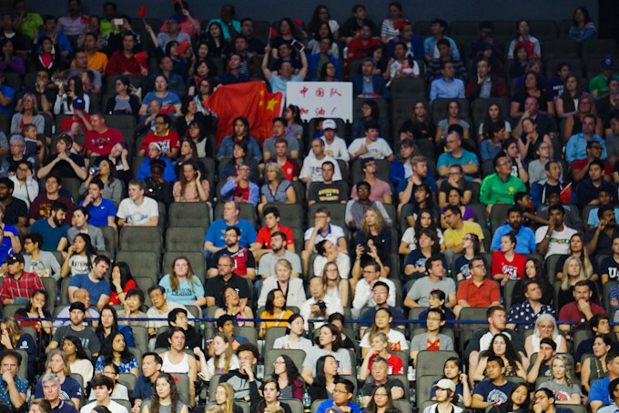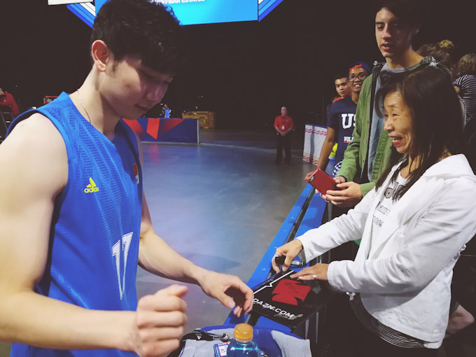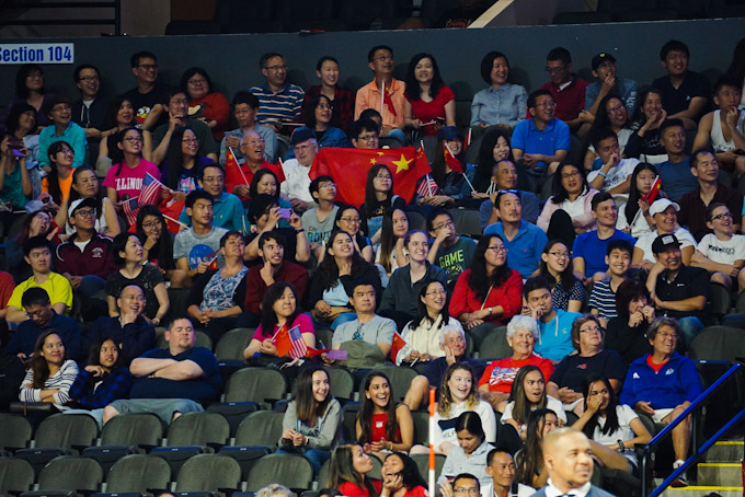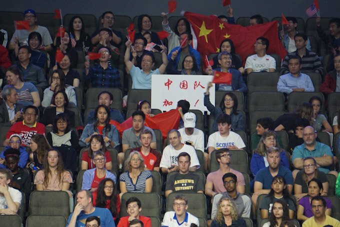 中国驻芝加哥总领馆赵建总领事和黄黎明副总领事拿着国旗为中国国家队加油助威!