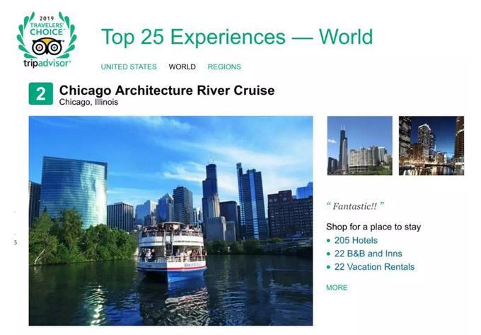 芝加哥侨学网综合】全球最大的旅游网站猫途鹰(TripAdvisor)日前公布了“2019年全球最佳旅游体验”前25强排行榜。芝加哥的“芝加哥河建筑之旅”,全球排名第二,在全球20多万个旅游项目中脱颖而出。