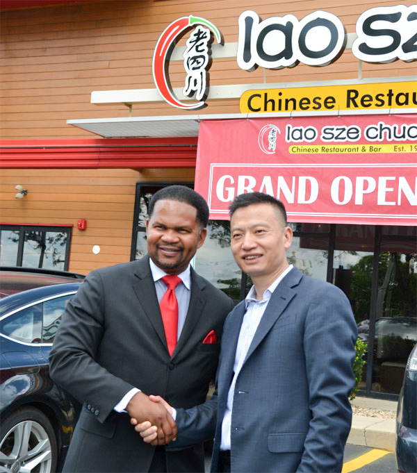 奥罗拉理查德市长(左)莅临道贺,右为美国老四川餐饮集团创始人、美国中餐学会主席胡晓军