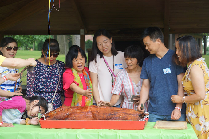 野餐联谊上的烤猪是亮点中的亮点!嘉宾纷纷和他合影