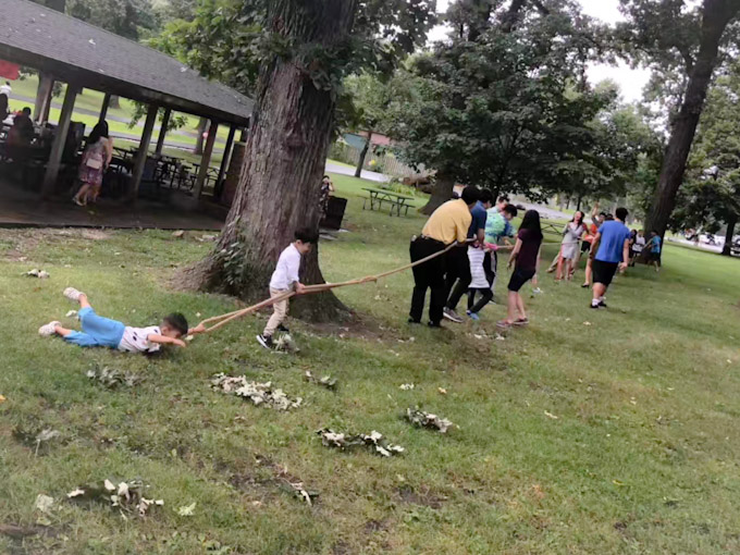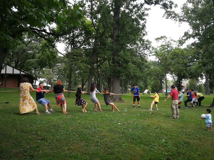 著名歌手刘金琰带来的民歌《美丽的心情》,第一次参加湖南同乡会野餐找到组织的声乐爱好者朱银燕带来《珠穆拉玛》,两度来芝加哥带孙子的黄泽和先生小号演奏,关孟华古筝工作室贺蕾带来的古筝独奏《小城故事》、《浏阳河》,徐荃和陈潇为大家带来英文歌曲对唱等等。大家沉浸在音乐带来的喜悦中。野餐美食之余,拔河大战上场,老中青三代选手,男女选手,齐心协力,享受快乐的周末时光。