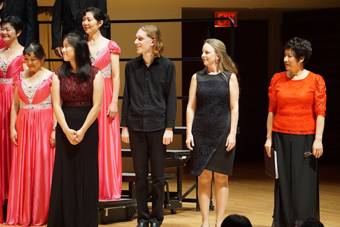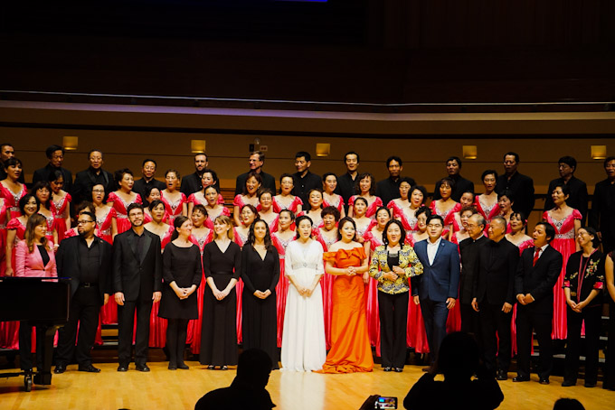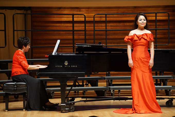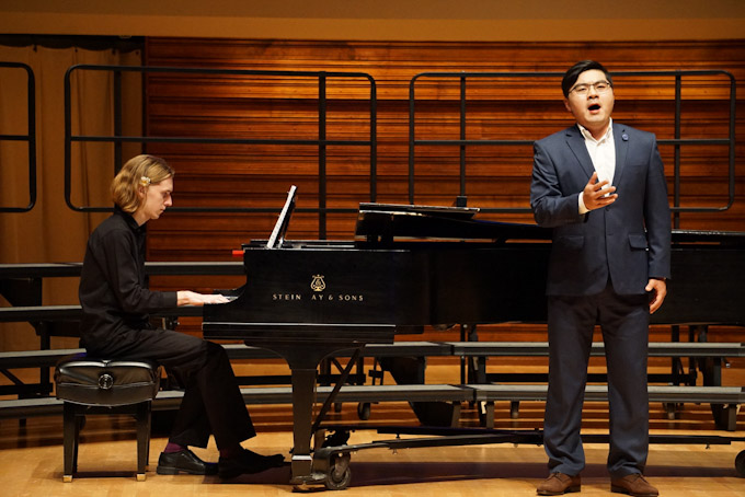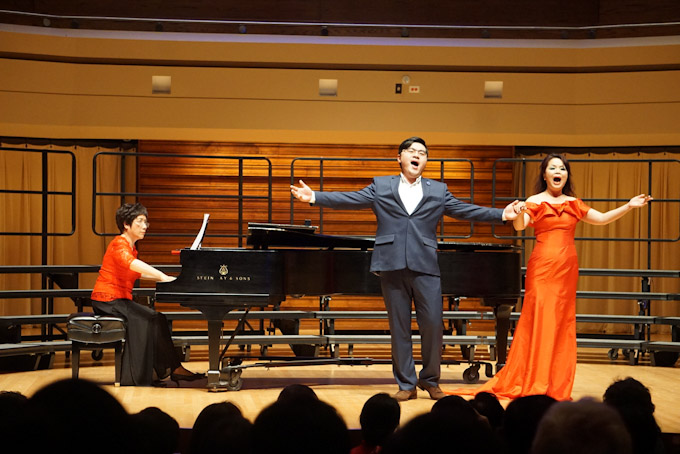 本次音乐会亮点之三,为优秀的留学海外的歌唱家设立了表演舞台。以优异成绩毕业于上海音乐学院,目前在肯特州立大学音乐学院就读研究生的戏剧男高音歌唱家越庆绪,在刚刚过去的第66届华盛顿国际声乐比赛中,作为全世界16位选手之一入围半决赛。当晚,他为芝加哥的观众朋友带来中文歌曲以及意大利歌剧。此外,曾多次举办个人独唱音乐会的花腔女高音歌唱家曾竹戈也从美国东部赶来为大家献唱。她的演唱,声音甜美,音色统一,具有很强的穿透力,作为东方艺术团多年的老朋友,她在芝加哥有着众多的粉丝,现场大家都掌声不断。越庆绪和曾竹戈一起合作,为大家带来意大利歌剧《你是我心中的一切》。