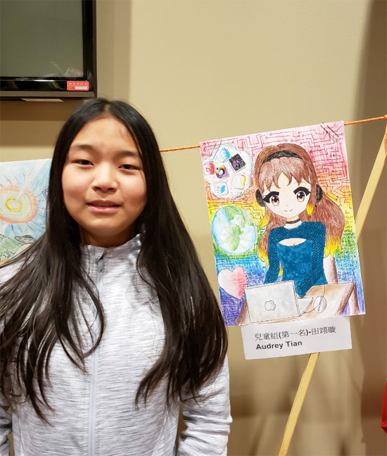 儿童组冠军Audrey Tian 在获奖作品前留影