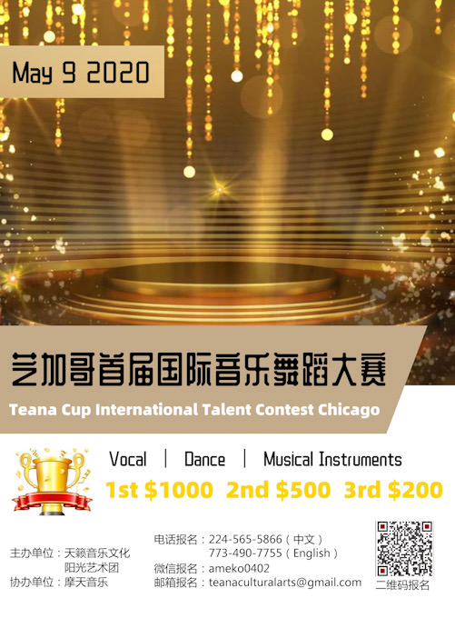 【芝加哥侨学网记者报道】天籁杯首届芝加哥国际音乐舞蹈大赛(Teana Cup International Talent Contest Chicago)即将在5月9日隆重举行!比赛不限国籍、不限年龄,不限专业,只要你有才艺,必将在我们为你准备的金色舞台上绽放!