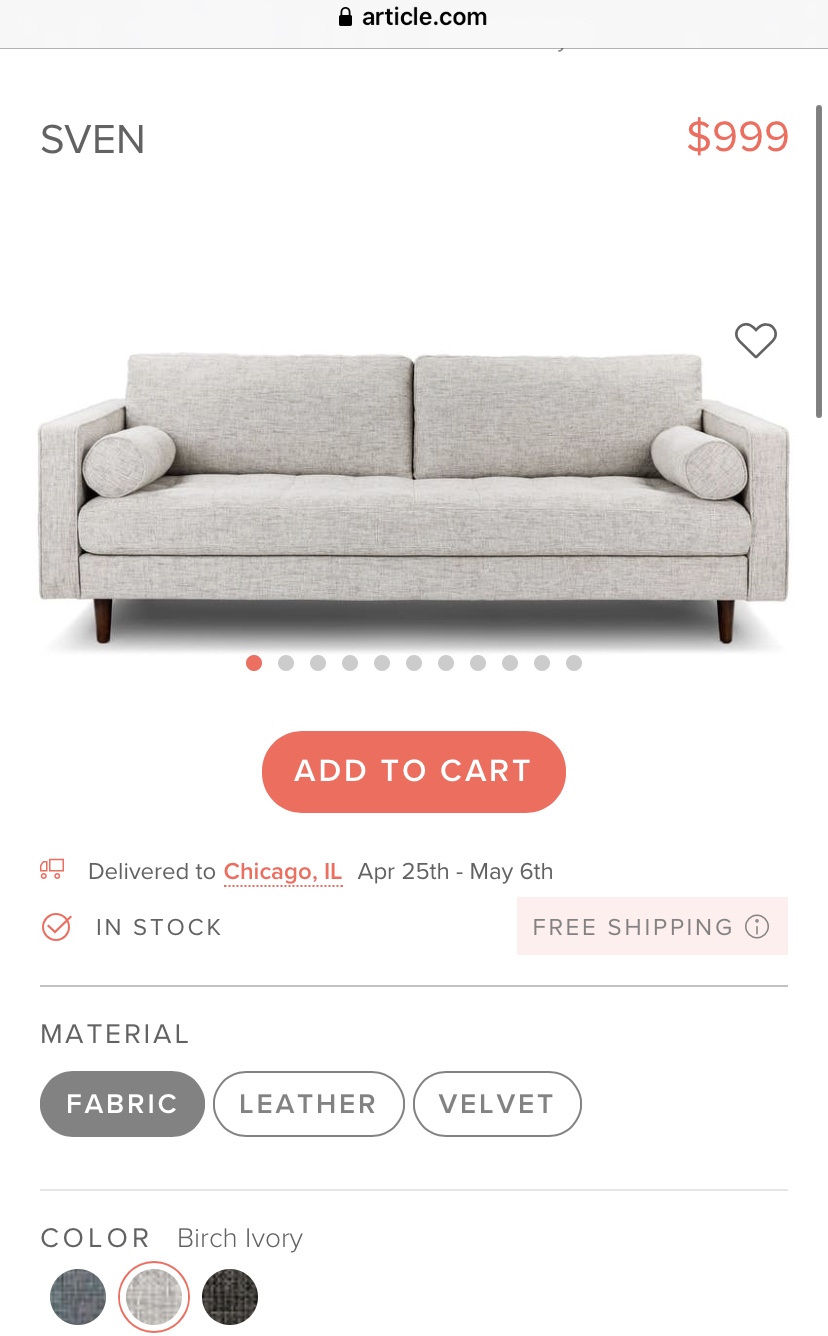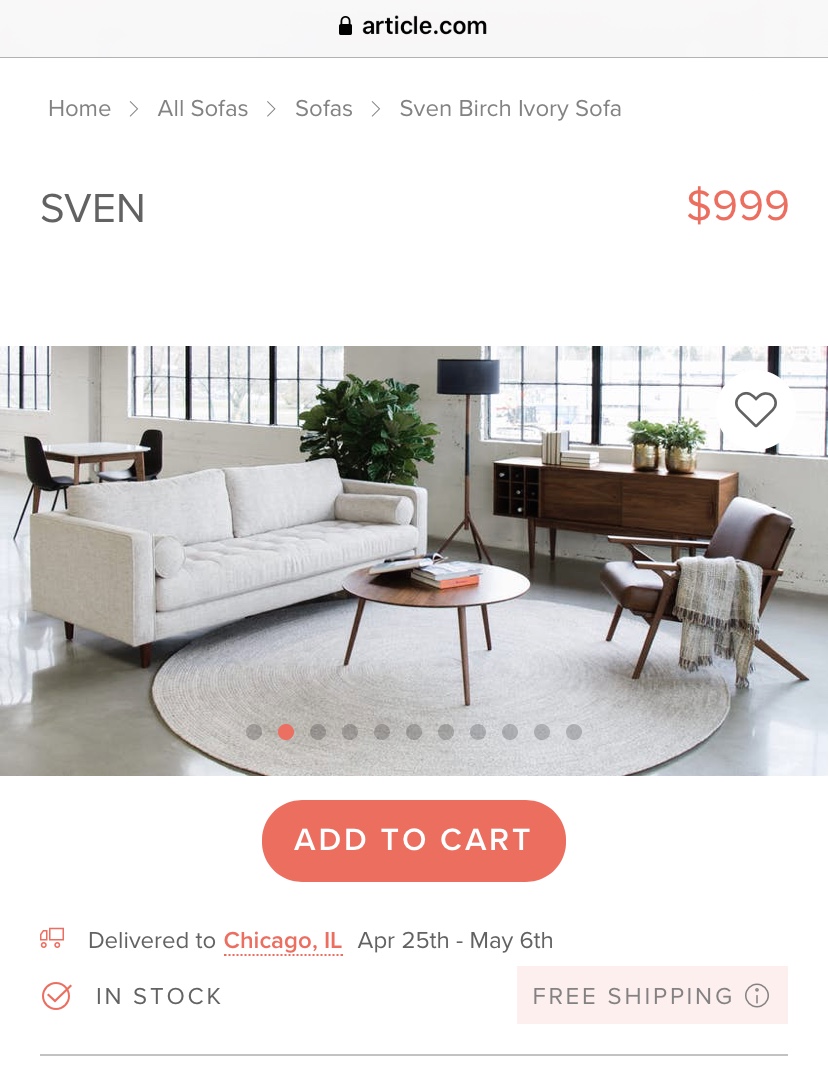 出Article的沙发,买来不到一年。原价加税1100,现$600出,可小刀