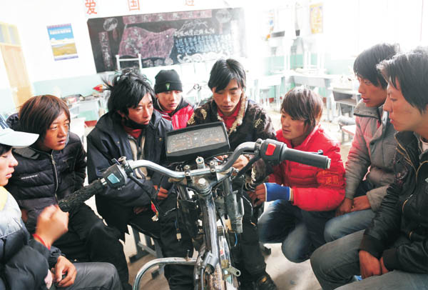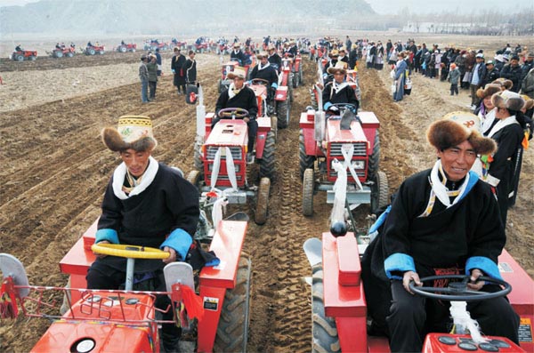 藏民在收割青稞作物。2010年西藏自治区的青稞总产量超过92万吨