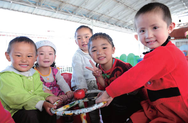 在拉萨市的一所幼儿园,汉族、回族、藏族小朋友在一起玩耍