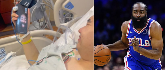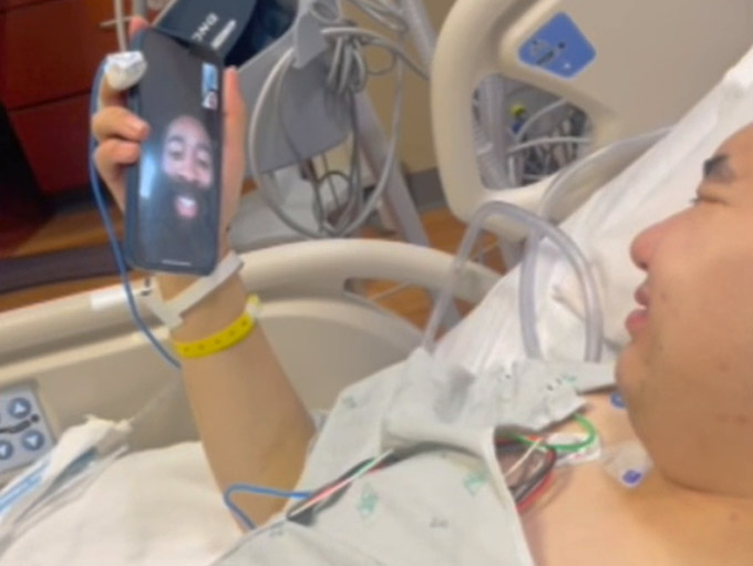郝昱凯在病床上与他崇拜的巨星哈登视频通话