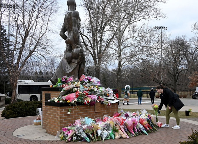 密西根州立大学校内的斯巴达雕像前,学生们为枪击案遇难者献花表哀思此枪击案的枪手与该大学毫无瓜葛,与遇难者、受伤者素昧平生,却在校园制造3死5伤的血案。