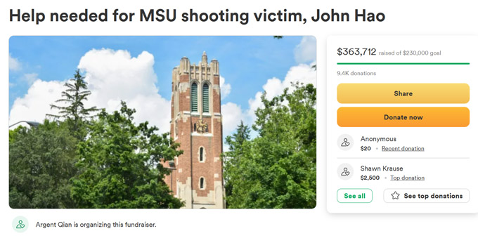 众筹捐款重新启动枪击案发生后,郝昱凯的室友钱亚健(Argent Qian)曾在GoFundMe网站发起筹款,不到两天时间内就筹集了超过35万美元的捐款。