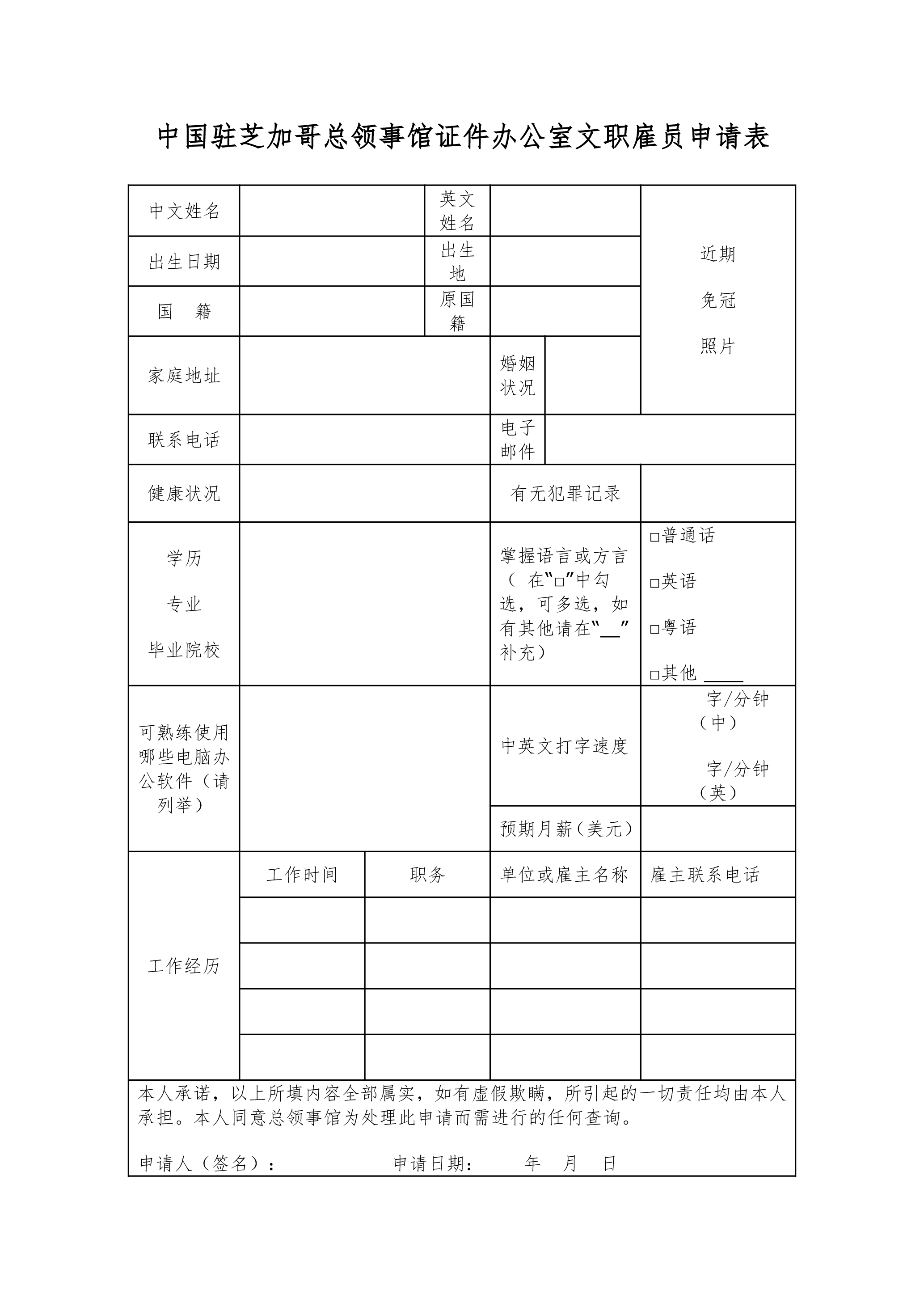 下载及打印《中国驻芝加哥总领事馆证件办公室文职雇员申请表》,请点击: