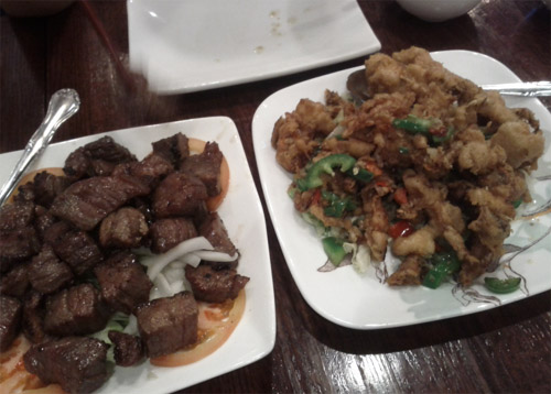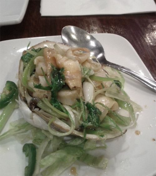 上周和老公去了传说中的聚一聚,居然在中国城一个很偏的街上,餐馆不大,居然生意不错。我两个人点了四个菜,法国牛肉,干煸豆角, 软壳蟹,外加汤,还有他家的特色大蚬贝,4.95一个,最好的就是大蚬贝啦。软壳蟹,法国牛肉都很好。中国城很多餐馆放太多油,酱油,味精啥的,吃了胃不舒服,这家的很好。隆重推荐,去吃一顿还打包第二天不做饭继续当懒人~~ 很搞笑的,旁边后来一桌老美,坐下后老往我们桌上瞟,等我们吃完出去,发现他们点的菜居然跟我们的一模一样