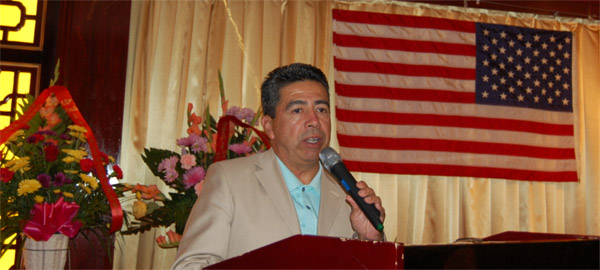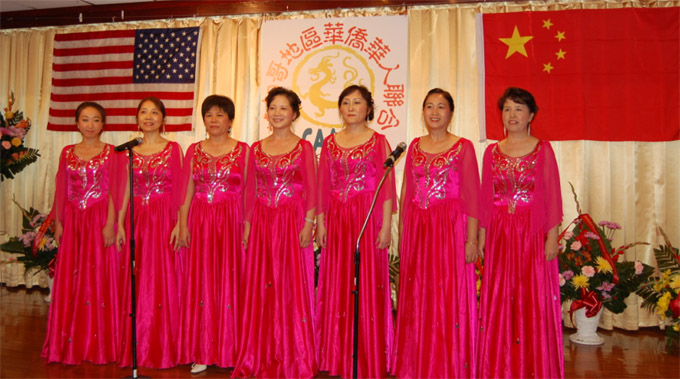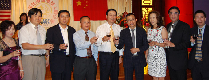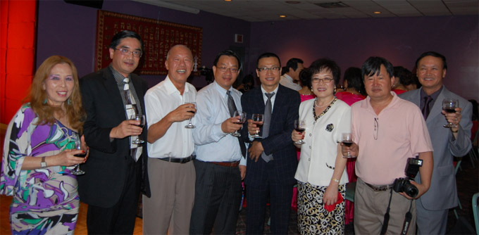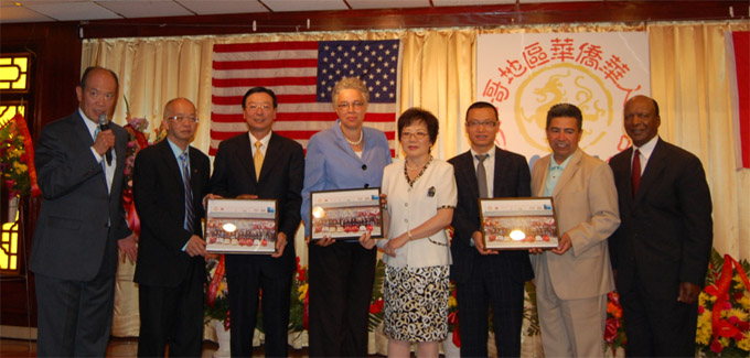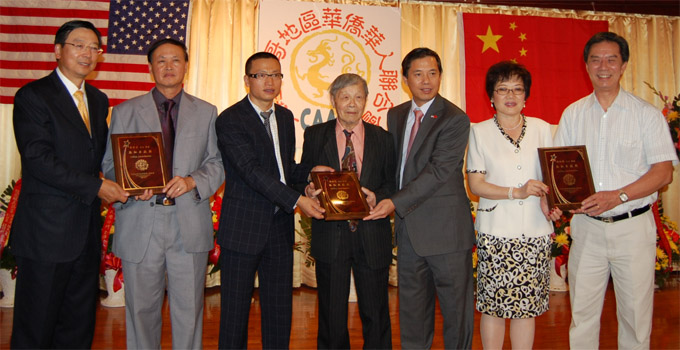 与和统会成员合影,右一为华联会副主席何达权,右二为和统会副会长、美国华网站长胡大江