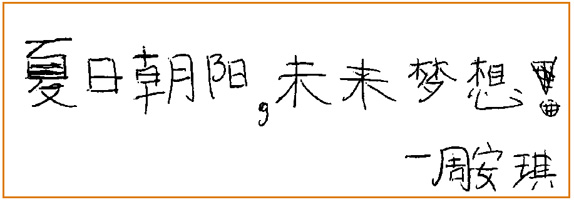 周安琪,自幼跟从父母在每个暑假期间回国探望亲朋好友,了解中国文化传统,游历名山大川,深深被古老的中国文化所吸引,因而喜爱中国的文字。从六岁开始她在周末积极参加美国的中文学校学习中文,进步很大,能达到说写流利,并连续四年获得中文学校颁发的优秀学生奖。