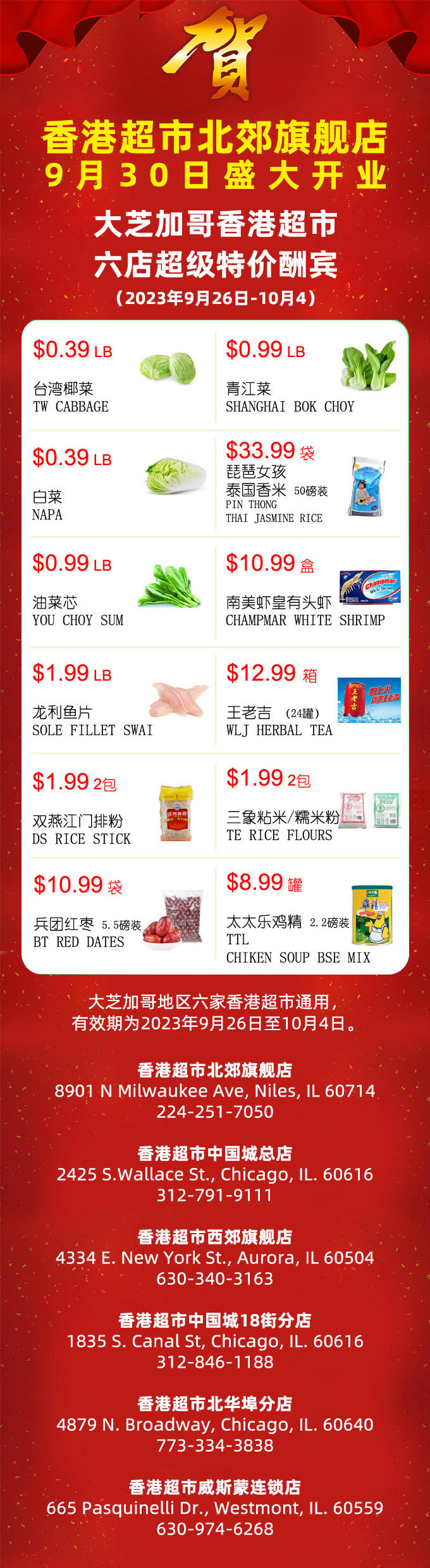华人超市美中区规模最大芝加哥北郊跨国公司总部云集、工商业繁荣,诸多北郊市镇华裔及亚裔居民众多。多年来,北郊亚洲超市由韩国超市独占鳌头,如今北郊华人居民终于盼来了香港超市的华人品牌。北郊香港超市位于北郊奈尔市(Niles,IL),是连接芝加哥市与北郊市镇的战略枢纽位置,近94号高速、294高速,交通便捷。