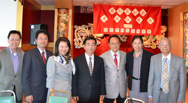 与会嘉宾合影,右起:华人互助会创办人黄怀德,芝加哥20警局局长Lucy Moy, 中华会馆主席徐学明、台北经文处葛葆萱处长,互助会荣誉主席黄于纹,侨教中心主任阎树森,赞助商代表State Farm 保险公司代理甄明德。