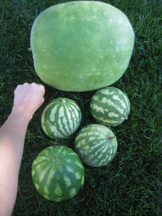 今年冬瓜没种,以前的种子今年自己发芽了,发的比较晚,所以掐头了,最后得了2个大的,1个小的,大的也有25磅呢。