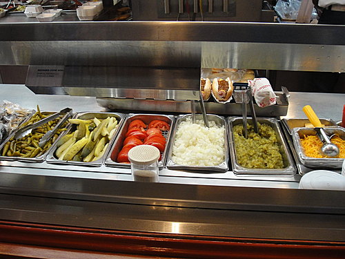 - 而Protillo’s 的热狗又被称为热狗中的极品,据说每一家protillo’s分店都又其各自的主题,喜欢主题餐厅的朋友们可以选好了再去,不过要提醒的是,入店自己找座位,他们店里面是没有人带位的L 还有这家店给你配的番茄酱不是给你用来配热狗滴,如果你不小心把番茄酱放到热狗里面,店家会认为你觉得他们的热狗不好吃。比较有名的是ChicagoStyle Hotdog